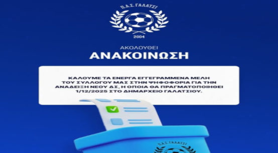 ΠΡΟΣΚΛΗΣΗ ΣΕ ΓΕΝΙΚΗ ΣΥΝΕΛΕΥΣΗ ΤΟΥ ΑΘΛΗΤΙΚΟΥ ΣΥΛΛΟΓΟΥ "Π.Α.Σ. ΓΑΛΑΤΣΙ". Προς όλα τα ενεργά μέλη του Συλλόγου. ======================= Το Διοικητικό Συμβούλιο του "Π.Α.Σ. ΓΑΛΑΤΣΙ", με απόφασή του στην συνεδρίαση του Δ.Σ. στις 30/10/2025 , αφού έλαβε υπόψη τα σχετικά άρθρα 11, 12, 13, 14,
