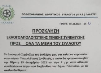 Σε συνέχεια της αναβολής της Γενικής Συνέλευσης του ΠΑΣ ΓΑΛΑΤΣΙ, τον Ιούνιο του 2022, για τεχνικούς λόγους, η διοίκηση του Συλλόγου ανακοινώνει την νέα ημερομηνία για την Γενική Συνέλευση που είναι και εκλογική. Ταυτόχρονα παρακαλεί θερμά όλους όσους αγαπούν τον Σύλλογο και ενδιαφέρονται για την πρόοδό του, να παρευρεθούν στην Τακτική Γενική Συνέλευση της 15ης Δεκεμβρίου , που θα καθορίσει την πορεία του συλλόγου για την επόμενη τριετία. Η πρόσκληση: