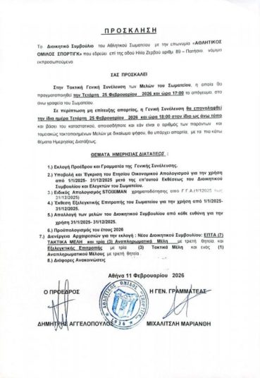 Η διοίκηση του ΑΟ ΣΠΟΡΤΙΓΚ προσκαλεί σε τακτική εκλογοαπολογιστική συνέλευση μελών στις 25 Φεβ. 2026, με θέματα ημερήσιας διάταξης όπως φαίνεται στην επίσημη πρόσκληση: