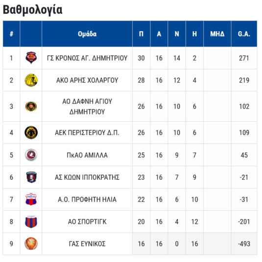 Τελική Βαθμολογία Α2 Γυναικών (Α’ όμιλος – Α’ υποόμιλος)