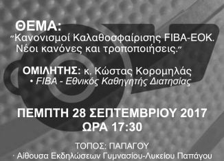 ΗΜΕΡΙΔΑ ΕΝΗΜΕΡΩΣΗΣ ΑΠΟ ΤΗΝ ΕΣΚΑ! Τη Πέμπτη 28 Σεπτέμβρη 17:30 στην αίθουσα εκδηλώσεων του Γυμνασίου-Λυκείου Παπάγου, ο κ. Κώστας Κορομηλάς, Εθνικός Καθηγητής Διαιτησίας FIBA, θα αναλύσει τις αλλαγές στους Κανονισμούς μπάσκετ που ισχύουν από τον Μάρτη το 2017, σε προπονητές, τεχνικούς διευθυντές, εφόρους και παράγοντες των Αθλητικών Σωματείων της ΕΣΚΑ. Η συμμετοχή και παρακολούθηση της εκδήλωσης κρίνεται επιβεβλημένη για όλους όσους πραγματικά ενδιαφέρονται να καθοδηγούν σωστά και χωρίς αλαλαγμούς τους αθλητές αλλά και τους φιλάθλους των ομάδων τους, για το καλό του