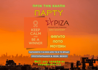 ΑΝΑΚΟΙΝΩΣΗ της ΟΡΓΑΝΩΣΗΣ ΜΕΛΩΝ ΣΥΡΙΖΑ-ΠΣ ΓΑΛΑΤΣΙΟΥ Σύντροφοι και συντρόφισσες, φίλοι και φίλες, Λίγο πριν το σφύριγμα της λήξης της προεκλογικής περιόδου, από τις 8 το βράδυ της Παρασκευής 7 Ιουνίου σας περιμένουμε με χαρά στο στο περίπτερο μας (Βεϊκου και Πρωτοπαπαδάκη) στο πάρτυ που οργανώνουμε με μουσικές, φαγητό (από τα χεράκια μας) και ποτό. Γιατί όλοι χρειαζόμαστε μικρές ανάσες διασκέδασης και κουβεντούλας πριν τη μεγάλη ελπιδοφόρα ΑΝΑΣΑ της βραδιάς των ευρωεκλογών! Για τη Συντονιστική Επιτροπή της ΟΜ Γαλατσίου Αρετή Καλεσάκη, Μαρίνος Μπουλούτης