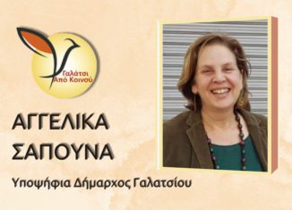 Η υποψήφια Δήμαρχος Γαλατσίου, κα Αγγέλικα Σαπουνά, μας έστειλε το παρακάτω δελτίο τύπου: Με χαρά και υπερηφάνεια παρουσιάζω στους/ις συμπολίτες/ισσες μας το ψηφοδέλτιο της δημοτικής παράταξης «Γαλάτσι Από Κοινού», της οποίας έχω την τιμή να είμαι επικεφαλής και υποψήφια Δήμαρχος. Είμαστε όλες και όλοι άνθρωποι δραστήριοι, όλων των ηλικιών, σε όλους τους τομείς επαγγελματικών και κοινωνικών δραστηριοτήτων. Και ταυτόχρονα, άνθρωποι της Αριστεράς, της Οικολογίας, του Πολιτισμού, των Κινημάτων Πόλης, με παρουσία –και ιστορία μακρόχρονη για πολλές και πολλούς από μας– στα κοινά