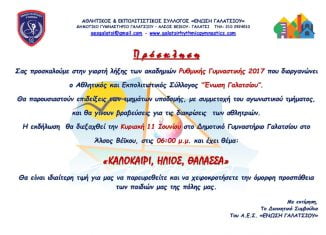 ΠΡΟΣΚΛΗΣΗ από ΑΕΣ "ΕΝΩΣΗ" ΓΑΛΑΤΣΙΟΥ Το τμήμα της Ρυθμικής Γυμναστικής της ΕΝΩΣΗΣ ΓΑΛΑΤΣΙΟΥ οργανώνει την γιορτή λήξης των Ακαδημιών του, την Κυριακή 11 Ιουνίου 2017, στις 18:00, στο κλειστό Γυμναστήριο του Άλσους Βέϊκου. Το πρόγραμμα της γιορτής περιλαμβάνει επίδειξη των τμημάτων Ρυθμικής, επίδειξη των αγωνιστικών τμημάτων και τέλος βραβεύσεις των αθλητριών που διακρίθηκαν τη περίοδο που πέρασε. Αριστερά η σχετική πρόσκληση από το τμήμα Ρυθμικής Γυμναστικής της ΑΕΣ ΓΑΛΑΤΣΙΟΥ.